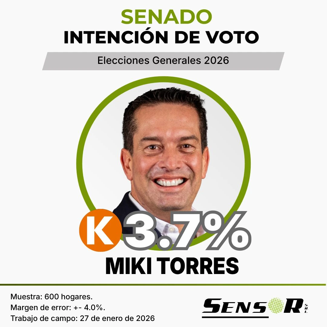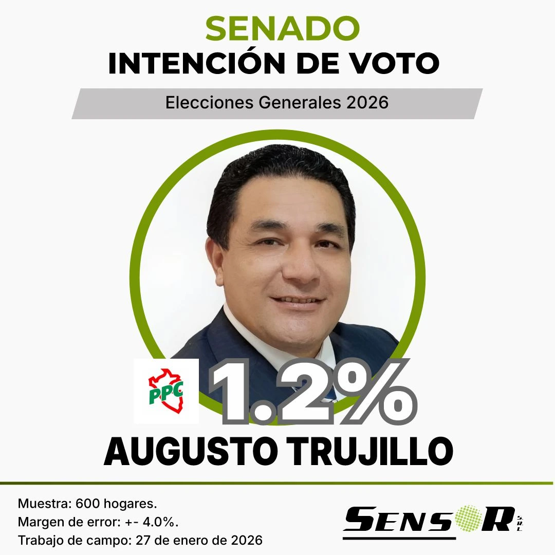 De acuerdo con el estudio, ningún postulante supera el 4% de intención de voto, lo que refleja un bajo nivel de definición ciudadana respecto a la elección senatorial. Entre los nombres con mayor mención figuran Fernán Altuve (3,8%), Miki Torres (3,7%) y Guillermo Aliaga (3,3%), seguidos por Lourdes Alcorta (2,8%) y José Williams (2,3%).